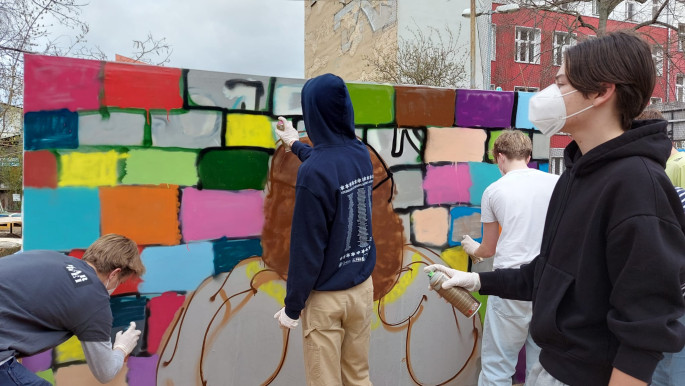 De volgende dag stond in het teken van het vieren van vrijheid, creativiteit en expressie. Want ook dat hoort bij Berlijn. Hier is ooit de graffiti-scene begonnen en later opgepikt door kunstenaars in New York en de rest van de wereld. Als echte street artists maakten de leerlingen een schets om die vervolgens op een stukje muur tot een heus kunstwerk uit te werken.
