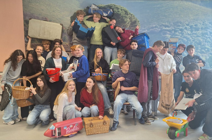 Gisteren startten ze deze laatste lesweek met een ludieke "alles-behalve-een-rugzak"-actie. Leerlingen vervoerden hun examenbundels in de origineelste tasvervangers, van hondenbench tot barbievliegtuig, gereedschapskist tot sombrerohoed.