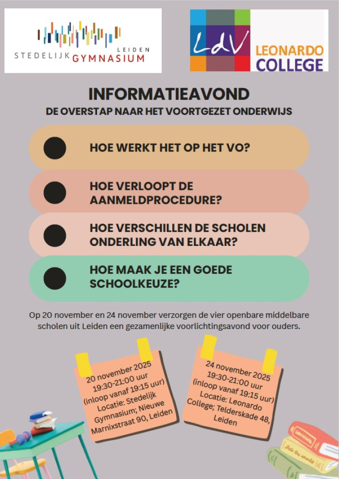 Op donderdag 20 november en maandag 24 november verzorgen de openbare middelbare scholen uit Leiden (de Da Vinci-scholen én het Stedelijk Gymnasium) een gezamenlijke voorlichtingsavond voor alle belangstellenden. U krijgt op deze avond een algemene voorlichting over de overstap naar het voortgezet onderwijs. Uiteraard is er ook de gelegenheid om vragen te stellen. Aansluitend kunt u, naar keuze, in korte rondes een presentatie van de aanwezige scholen bezoeken. De avonden zijn inhoudelijk gelijk.